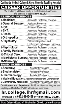 Continential Medical College & Hayat Memorial Teching Hospital Jobs 04-05-2025